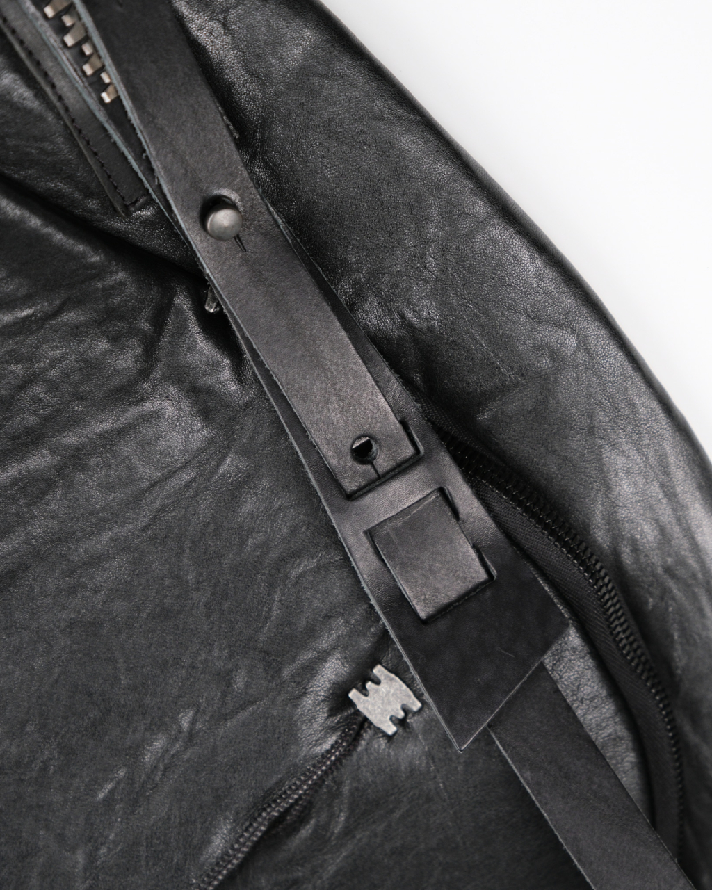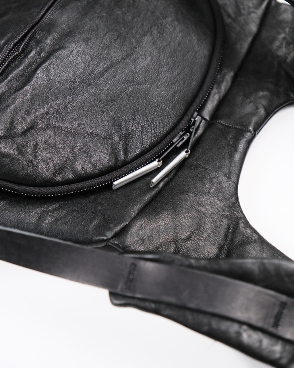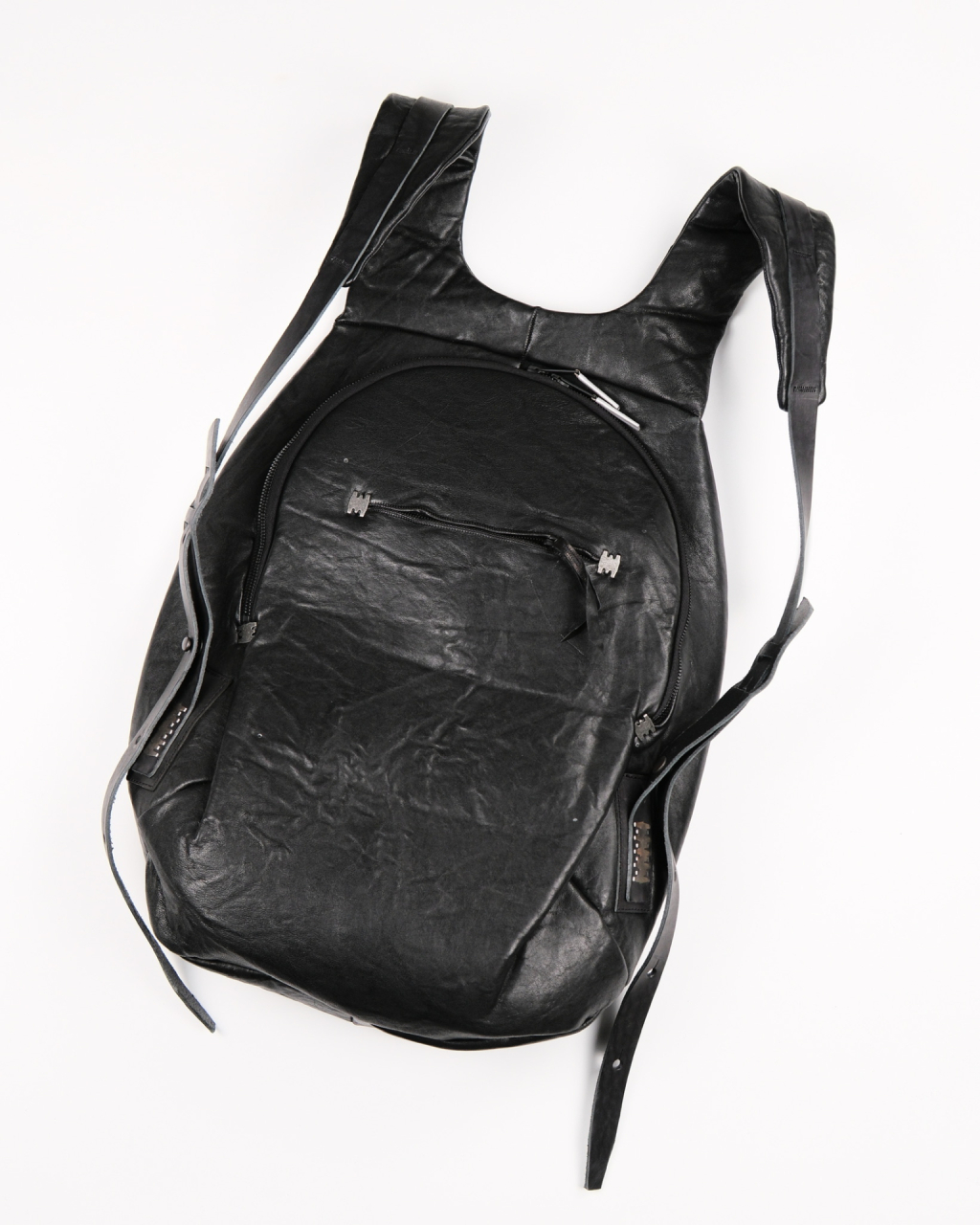 Unisex large backpack in black bonded lamb leather featuring signature metal staples from Isaac Sellam. Made from an Italian lamb leather bonded with a foam material.